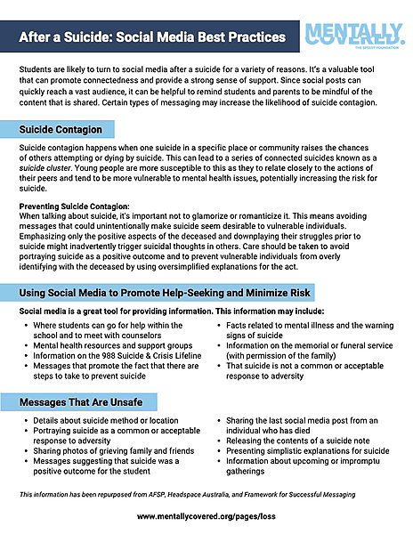 Guidelines for safely sharing information online after a suicide, promoting supportive messaging, reducing risk, and encouraging help-seeking.