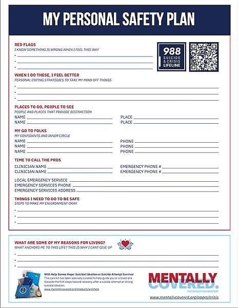 Customizable safety plan outlining warning signs, coping steps, supportive contacts, and crisis resources for staying safe.