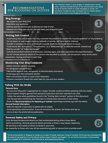 A practical guide for bloggers offering best practices for safely writing about suicide, promoting awareness, reducing harm, and connecting readers to support and resources.