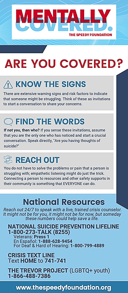 A compact, visually engaging card that highlights The Speedy Foundation’s programs, services, and resources, providing quick access to mental health support and information for the community.