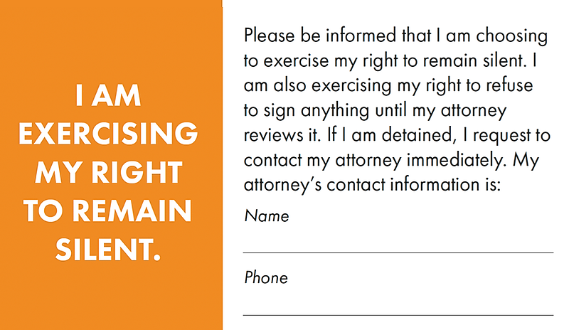 A small, easy-to-carry card that clearly states your rights during encounters with law enforcement or immigration officers. It helps you assert your right to remain silent and ask for an attorney, protecting you and your family in stressful situations.